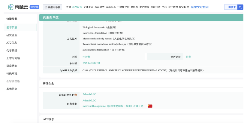 据药融云数据库显示:2023年8月15日,信达生物研发的PCSK-9抑制剂托莱西单抗注射液(tafolecimab,研发代号:IBI306)获得国家药品监督管理局(NMPA)批准上市,治疗原发性高胆固醇血症(包括杂合子型家族性和非家族性高胆固醇血症)和混合型血脂异常。托莱西单抗成为国内首款获批的自主研发的重组全人源抗PCSK-9单克隆抗体。本品相关专利WO-2018113781。最早与Adimab合作开发。