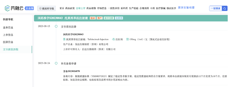 2023年8月底,托莱西单抗注射液开始正式在中国市场销售,药融云数据www.pharnexcloud.com显示:150mg(1ml)/支/盒的价格为1388.00元人民币。