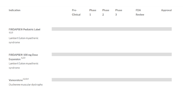 以患者为中心,Catalyst Pharmaceuticals致力于开发和商业化创新的一流药物,治疗罕见的神经和癫痫疾病。Catalyst Pharmaceuticals当前研发管线只有三个产品,正如前面所提到的,其中一个还是今年七月份才从Santhera Pharmaceuticals获得。各管线具体情况如下: