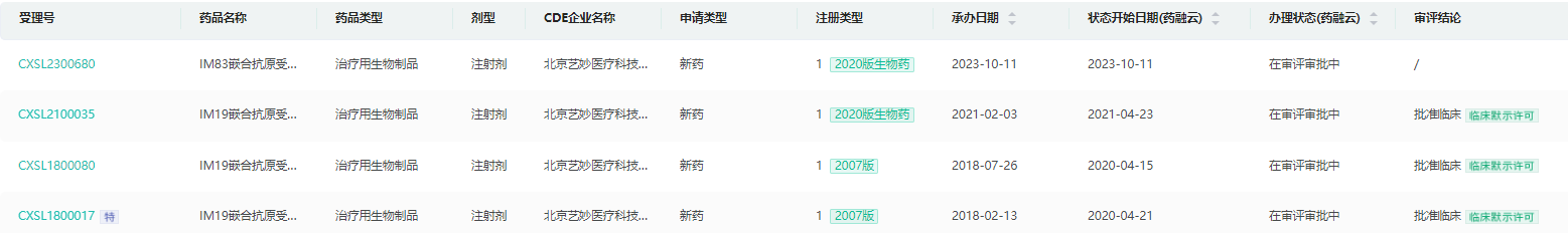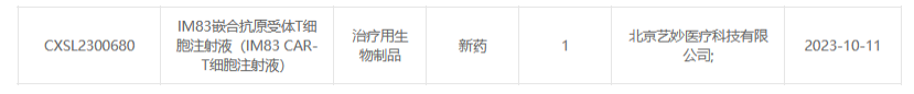 10月11日,据CDE官网显示,北京艺妙医疗科技有限公司(简称“艺妙医疗”)的“IM83嵌合抗原受体T细胞注射液(IM83 CAR-T细胞注射液)”的IND申请获得CDE受理。