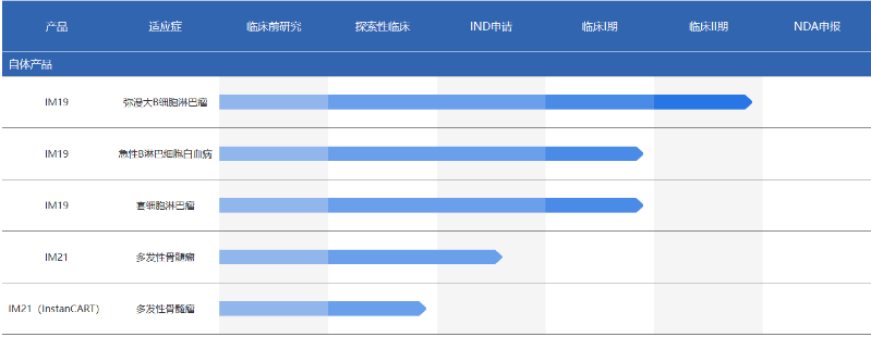 今年8月,IM19针对复发或难治的弥漫大B细胞淋巴瘤的II期临床试验已正式完成患者入组,预计今年下半年提交产品上市申请(NDA),有望成为国内首个获批上市的针对CD19靶点(反复淋巴瘤的重要靶点之一)的自研CAR-T细胞治疗药物。