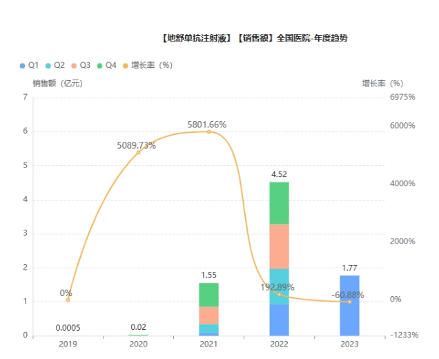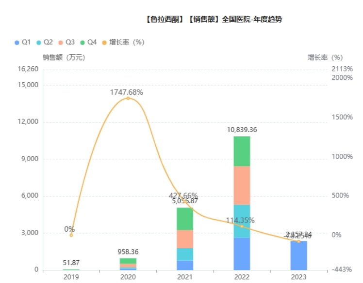 而在国内,鲁拉西酮片在2019年1月获得国家药品监督管理局(NMPA)上市许可,并于9月正式在中国上市,2021年3月,正式纳入国家医保目录。药融云数据显示,鲁拉西酮2022年院内销售额突破1亿元,同比增长114%,扩容速度可观。