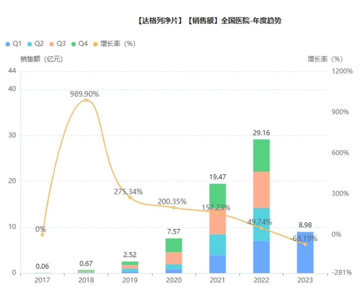 据阿斯利康财报显示,2022年达格列净片全球销售额高达43.81亿美元,同比增长46%。在国内市场,该产品于2019年通过谈判纳入国家医保乙类目录。据药药融云数据,2022年院内销售额已近30亿元,为糖尿病用药TOP1品种,同比增长超50%;2023年Q1继续保持良好增速。