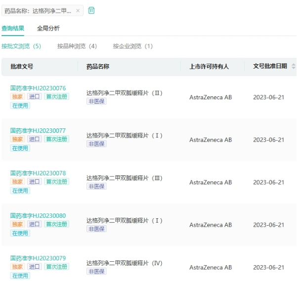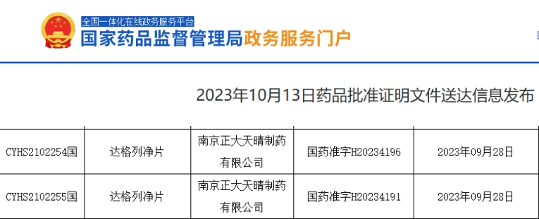 据NMPA官网最新公示,南京正大天晴的4类化学药品达格列净片已于近日获批生产(国药准字H20234196/国药准字H20234191),视同通过一致性评价。至此,该品种国内已累计有6家药企过评。