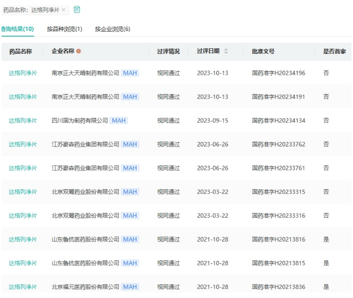据药融云数据库显示,该药目前国内仅6家企业获批,其中山东鲁抗医药、北京福元医药为首仿,南京正大天晴为第6家获批的药企。另有齐鲁、石药、倍特、华东医药等26家企业提交了达格列净片的仿制上市申请,涉及35个受理号。可以预见,未来国内达格列净片市场将出现激烈的竞争局面。