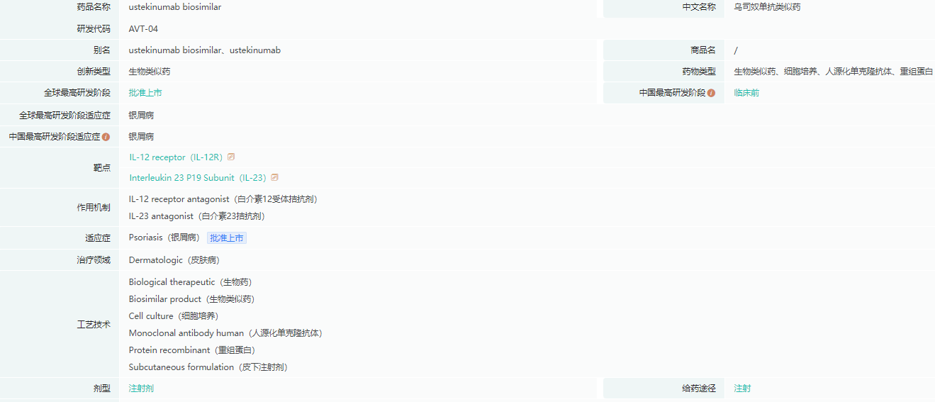 AVT04 是一种单克隆抗体,也是Stelara®(乌司奴单抗)的候选生物仿制药。乌司奴单抗与两种细胞因子 IL-12和IL-23结合,这两种细胞因子参与炎症和免疫反应。AVT04是一种研究产品,尚未获得任何国家的监管批准。监管机构尚未确定其生物类似药相似性。