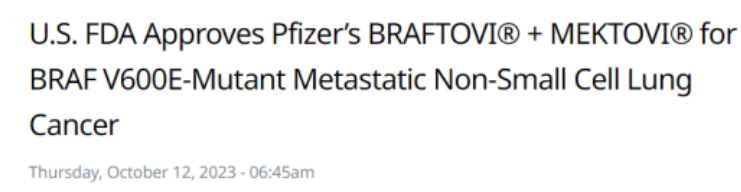 10月12日,辉瑞(Pfizer)宣布FDA批准其药品Braftovi与Mektovi组合疗法的补充新药申请(sNDA),用以治疗经FDA核准测试带有BRAF V600E突变的转移性非小细胞肺癌(NSCLC)患者。