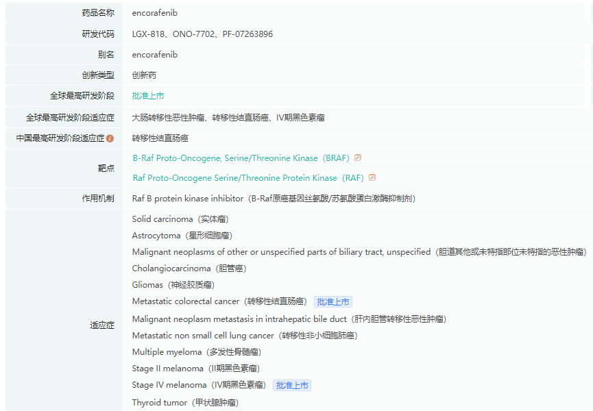 Braftovi还被批准与西妥昔单抗联合用于治疗具有 BRAF V600E 突变的转移性结直肠癌成年患者。