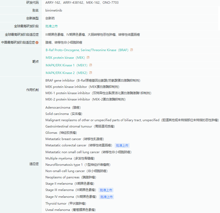 2018年,美国FDA首次批准BRAF V600E或V600K突变的不可切除或转移性黑色素瘤的联合治疗,当时辉瑞的子公司Array Bio Pharma拥有该药。