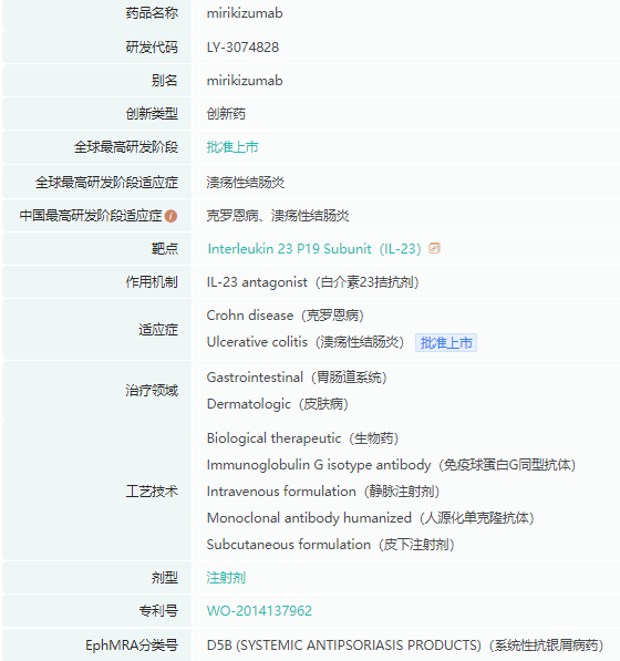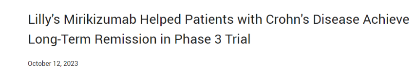 近期,礼来公司表示,其抗炎药物mirikizumab 在一项III 期研究一年后帮助约一半克罗恩病患者进入缓解状态。这家印第安纳波利斯大型制药公司计划明年向FDA提交数据,希望获得上市批准,从而与许多其他克罗恩病药物竞争。