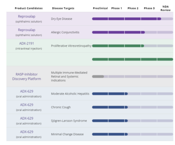 Reproxalap是一种新型的小分子免疫调节共价RASP(活性醛化物质)抑制剂,能降低RASP水平,达到抑制炎症缓解症状的作用。RASP含量在眼部或全身性炎症性疾病中升高,可造成眼睛发炎发红、泪液分泌量降低以及泪液内脂质组成改变,许多干眼病患者具有较高的RASP含量。