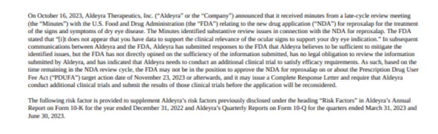 根据NDA审查周期的剩余时间,FDA可能无法在《处方药使用者付费法案》(PDUFA)的目标行动日期2023年11月23日或该日期前后批准该NDA,相反FDA可能会发出一份《完全答复函》,要求Aldeyra在重新考虑批准其申请之前进行更多的临床试验。