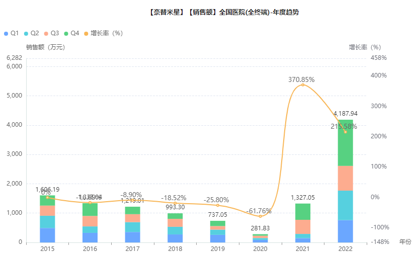药融云数据显示,加兰他敏注射剂2022年在医院全终端市场的销售规模近5亿元,同比增长918.61%;奈替米星注射剂2021年在医院全终端市场的销售额为1327.05万元,同比增长370.85%。