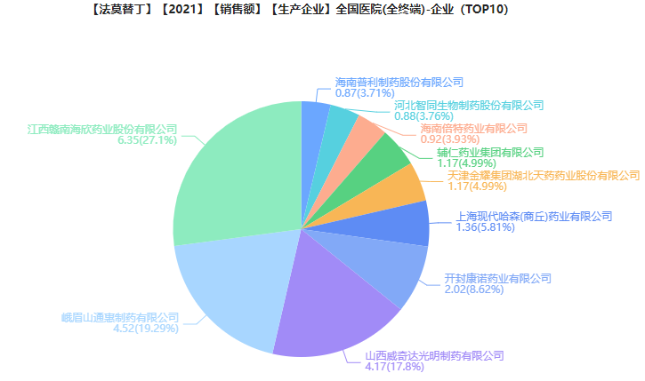 后来法莫替丁授权给默克(美国)、默沙东(美国之外)、Salix、强生等公司,目前已在超过110个国家销售。药融云全国医院销售(全终端)数据库显示,2016-2022年以来法莫替丁在全国医院终端市场的销售额一直保持大幅增长态势,2021年销售额达到31.22亿元,同比增长219.20%;销售额TOP3企业分别是:江西赣南海欣药业(占比27.1%)、峨眉山通惠制药(占比19.29%)、山西威奇达光明制药(占比17.8%);其给药途径以注射剂为主,占比高达98%。