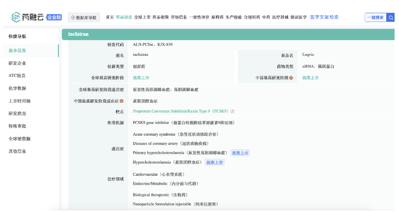 2023年8月22日,诺华首创的PCSK9 小分子干扰RNA(siRNA,Small Interfering RNA Drug)降胆固醇药物Inclisiran(英克司兰钠/乐可为®)在中国获批上市;作为辅饮食的辅助疗法,用于治疗成人原发性高胆固醇血症(杂合子型家族性和非家族性)或混合型血脂异常患者。