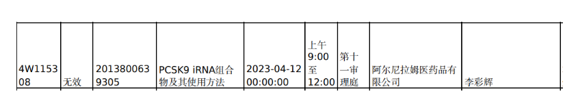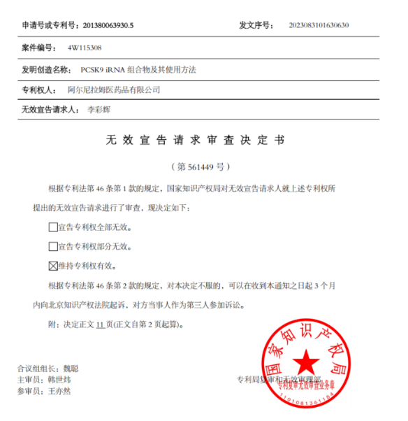 君实生物子公司君拓生物向Inclisiran的核心专利提起无效宣告请求(Alnylam的ZL201380063930.5“PCSK9 iRNA组合物及其使用方法”)。本发明涉及靶向PCSK9基因的RNAi剂例如双链RNAi剂,和使用这类RNAi剂来抑制PCSK9表达的方法以及治疗患有脂质失调例如高脂血症的受试者的方法。不过,2023年8月,国家知识产权局维持该专利有效。