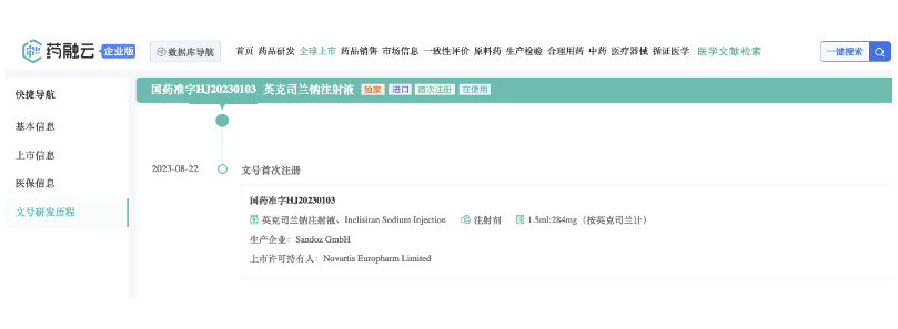 据药融云数据库显示:2021年12月22日,美国FDA终于批准本品上市;在2022年1月推向美国市场。Inclisiran在2022年全年业绩为1.12亿美元。2023年上半年,本品销售额达到1.42亿美元。