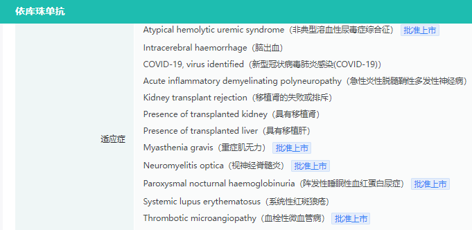 依库珠单抗注射液在中国可用于治疗成人和儿童阵发性夜间血红蛋白尿症(PNH)、非典型溶血性尿毒症综合征(aHUS)以及成人难治性全身性肌无力(gMG)。Soliris还在全球许多国家被批准用于多种适应症。