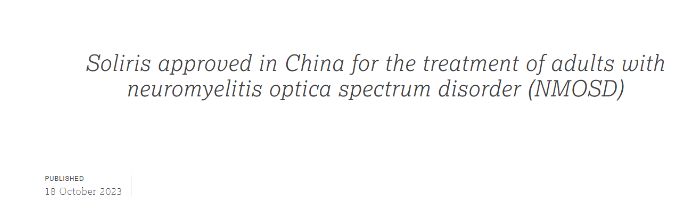 10月18日,阿斯利康(AstraZeneca)宣布依库珠单抗注射液(eculizumab)已在中国获批用于治疗抗AQP4抗体阳性(Ab+)的成年神经脊髓炎视网膜频谱病变(NMOSD)患者,这是中国首个也是唯一一个获准用于治疗NMOSD的补体抑制剂。