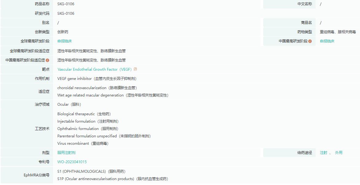 SKG0106于今年6月获美国食品药品监督管理局(FDA)的批准开展治疗新生血管性年龄相关性黄斑变性(nAMD)全球I/IIa期临床试验,全球临床试验已启动。