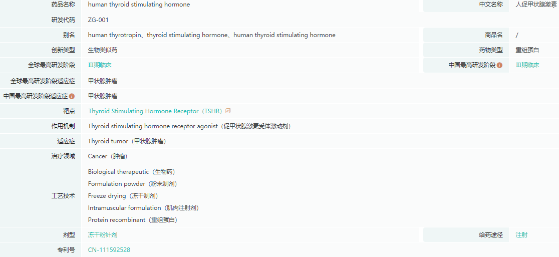 注射用重组人促甲状腺激素(rhTSH)是泽璟制药研发的生物大分子药物,属于治疗用生物制品。人体内源性的促甲状腺激素是糖蛋白激素家族成员,主要在人垂体表达、分泌入血并和表达于甲状腺细胞和高分化的甲状腺癌细胞表面的促甲状腺素受体重组蛋白(hTSHR)蛋白结合,可刺激碘摄取和有机化,以及甲状腺球蛋白(Tg)、三碘甲状腺原氨酸(T3)和甲状腺素(T4)的合成和释放。此次达到主要终点的ZGTSH004试验是一项开放、单臂、自身对照、多中心的3期临床研究,在中国医学科学院北京协和医院、河南省肿瘤医院等研究中心开展。