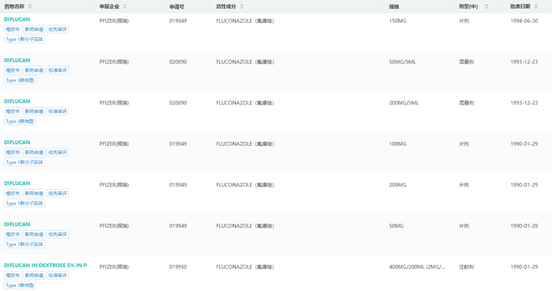 氟康唑(商品名:DIFLUCAN)原研公司为辉瑞(PfizerINC),于1981年获得化合物专利,1988年3月在法国批准上市,后于1990年1月由美国FDA正式批准该药品口服和静脉注射用于治疗隐球菌性脑膜炎和各种念球菌病。其干混悬剂于1993年在美国获得批准上市。