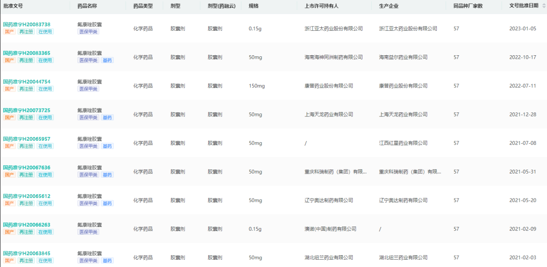 据药融云数据库统计,目前国产氟康唑片市场批文有31条,涉及20家生产企业,其中通过一致性评价的企业共5家,包括科伦药业、扬子江药业、遂成药业、石四药、上海桓华制药。国产氟康唑胶囊的市场批文有83条,涉及64家生产企业,其中通过一致性评价的企业共3家,包括成都倍特药业、辽宁奥达制药、浙江苏可安药业。
