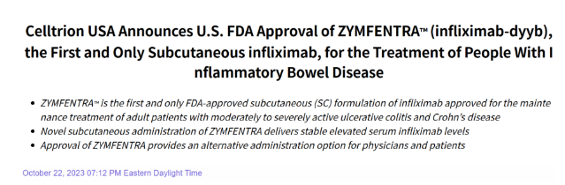 Zymfentra是Celltrion公司Inflectra的皮下版本,这也是FDA批准的首款英夫利昔单抗皮下制剂。ZYMFENTRA预计于2024年第一季度上市,在产品上市之前,公司不会公布价格。