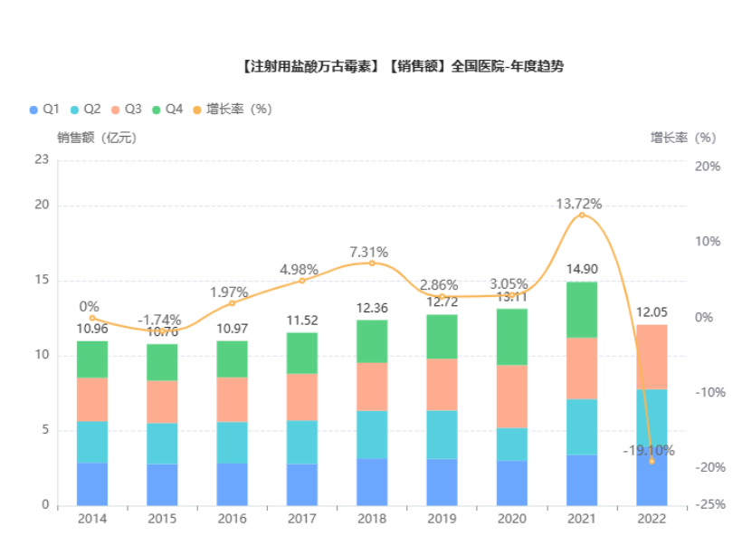 万古霉素作为第一个问世的糖肽类抗生素,原研由礼来开发,该品种在1958年获得FDA的批准上市,目前在世界卫生组织基本药物标准清单中有收载,已经在全球广泛上市销售。万古霉素对多种革兰阳性菌有杀菌活性,是治疗MRSA感染的首选药物。作为抗生素王牌,万古霉素被誉为“人类最后一道防线”,近年来在中国的市场处于稳定增长中,据药融云数据库,2022年注射用盐酸万古霉素斩获近近16亿院内销售额,其中原研市场占有率近80%。