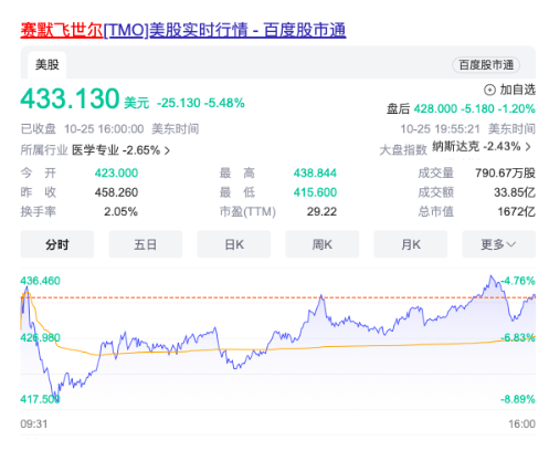截止发稿,赛默飞世尔的股票下跌超5%,市值1672亿美元。