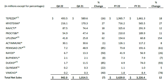 2023年上半年,Horizon Therapeutics营收17.77亿美元;2023Q1营收8.32亿美元,同比下降6%。Krystexxa 2023Q1 业绩为1.87亿美元,同比增长77%。Tepezza 2023Q1业绩为4.05亿美元,同比下降19%;Pennsaid 2%® (双氯芬酸外用2%溶液)2023Q1业绩为920万美元,同比下降74%。
