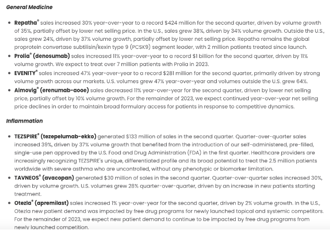 2023年上半年,安进营收130.91亿美元,同比增长6%。销量增长主要来源于 Evenity、Blincyto(4亿美元)、Repatha(销售额8亿美元,同比增长24%)、Lumakras (1.5亿美元,同比略增)和 Kyprolis以及生物类似药Amjevita等等。