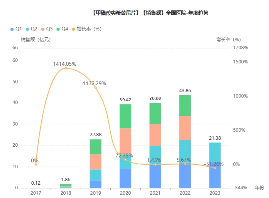 据药融云数据库,2022年,奥希替尼院内销售额达43.9亿元,是阿斯利康当之无愧的头号单品。