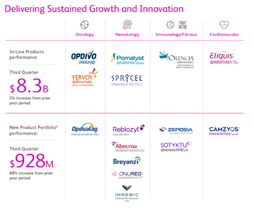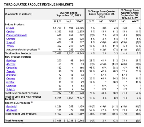 近期,百时美施贵宝(BMS)公布了2023年第三季度财报:营收110亿美元同比下降2%,原因是Revlimid的销量下降,该药物的仿制药于2022年进入美国市场。其中成熟产品(In-Line)收入83亿美元,同比增长3%;新上市产品(New Product Portfolio)收入9.28亿美元,同比增长68% 。