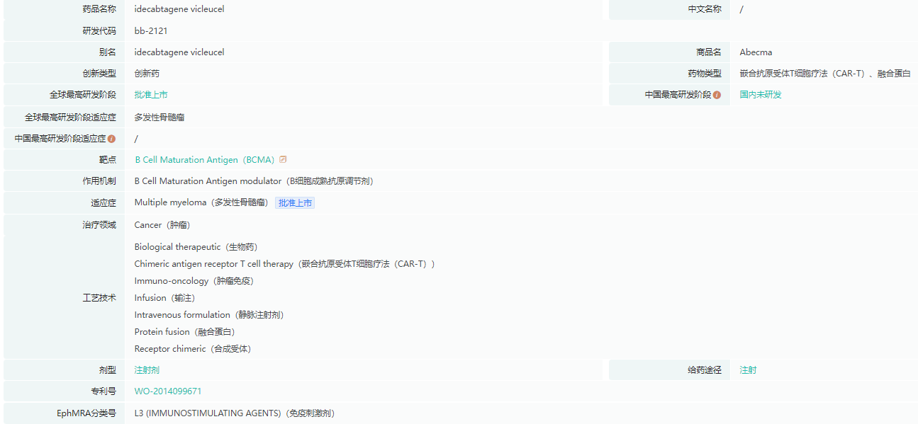 Abecma由百时美施贵宝(BMS)和Bluebird公司联合开发,是获批治疗复发性/难治性多发性骨髓瘤的三种 CAR-T 疗法之一,是全球首款靶向BCMA的CAR-T细胞疗法,是FDA批准的第五款CAR-T疗法。