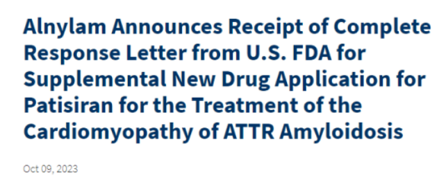 10月9日,Alnylam Pharmaceuticals宣布:美国FDA拒绝批准其RNAi疗法patisiran(商品名:onpattro)用于治疗转甲状腺素蛋白淀粉样变性心肌病(ATTR-CM)的上市申请。