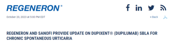 10月20日,再生元和赛诺菲宣布收到美国FDA就Dupixent(度普利尤单抗)治疗慢性自发性荨麻疹(CSU)的补充生物制剂许可申请(sBLA)发出的完整回复函(CRL)。CRL指出,需要额外的疗效数据来支持批准。再生元表示一项正在进行的临床试验(Study C)将继续招募患者,预计在2024年底获得结果,将提供额外的疗效数据。