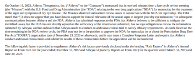 2023年10月16日,眼科药物开发商Aldeyra Therapeutics(纳斯达克股票代码:ALDX)在向美国证券交易委员会(SEC)提交的一份文件中披露,由于疗效数据不足,美国食品及药物管理局(FDA)可能不会批准其药物Reproxalap 用于治疗干眼症。