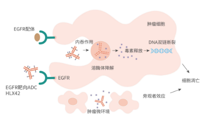 HLX42由高度特异性的人源化lgG1 EGFR抗体分子、可裂解的新型连接子-荷载毒素偶联制备而成,其药物抗体比(drug-to-antibody ratio, DAR)约为8。其中,HLX42的荷载毒素为一种新型DNA拓扑异构酶I(Topoisomerase I)小分子抑制剂,通过造成DNA双链断裂,阻断DNA复制,从而导致肿瘤细胞凋亡。静脉输注后,HLX42的连接子-毒素能够在肿瘤微环境中特异性裂解释放,具备较强的旁观者杀伤效应,独特的作用机制使得HLX42较同类ADC产品具有更大的治疗窗口,增强ADC在实体肿瘤中的治疗效果。