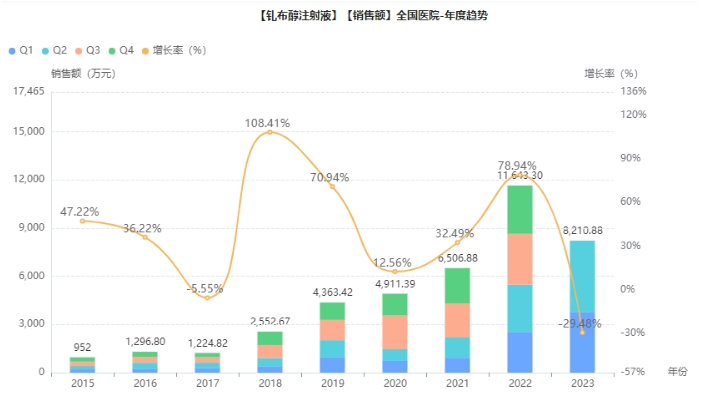据药融云统计,钆布醇注射液在2022年院内销售额突破1亿元,同比增长了79%,2023年销售数据增长趋势也非常可观,H1同比增长了50%。