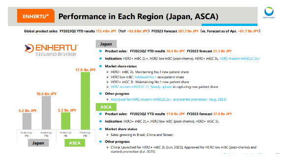 随着Enhertu在中国获批上市治疗HER2阳性晚期乳腺癌二线治疗和HER2低表达(IHC 1+或IHC 2+/ISH-)不可切除或转移性乳腺癌,其在亚洲市场也迎来了快速销售增长。