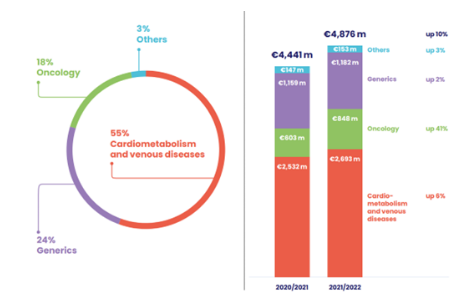 从销售收入分布的业务领域来看,心脏代谢和静脉疾病药物的销售额占合并销售收入的55.2%。 Daflon®(Micronized purified flavonoid fraction,达夫隆)连续第二年成为集团销量最大的药物。 肿瘤学领域的销售收入比上一年激增40.7%,达到8.48亿欧元,使其在集团销售收入中的份额达到17.4%,而2020/2021年的份额为13.6%,这支持了施维雅在该领域的增长战略。这一业绩尤其受到Tibsovo ® 销售额的推动,同比大幅增长,因为该药物在2021年4月1日收购Agios Pharmaceuticals的肿瘤部门后,才进入2020/2021财年的投资组合。
