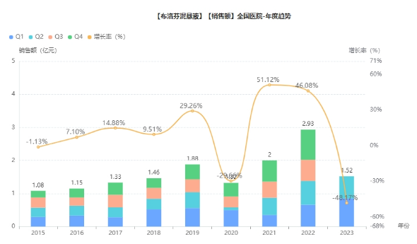 布洛芬混悬液属于混悬液,为丙酸类非甾体抗炎药,具有抗炎、镇痛、解热作用。是儿科常见的退热药物,也用于缓解儿童轻至中度疼痛,如头痛、关节痛、偏头痛、牙痛、肌肉痛、神经痛。布洛芬混悬液最早在德国上市,后来1995年在美国FDA获批上市。2022年院内销售近3亿,同比增长达到47%。