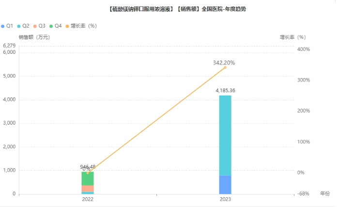 目前国内临床常用的肠道清洁准备药物包括复方聚乙二醇电解质散、磷酸钠盐口服溶液等。2020年硫酸钠钾镁口服溶液尚未进入市场,2022年开始进军市场,2022院内销售额达到947万元,2023年上半年销售额突飞猛进,销售额突破千万,达到4185万元,涨幅342.2%。