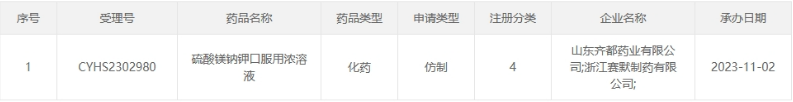 据CDE官网,近日山东齐都药业/浙江赛默制药递交的4类仿制化药硫酸镁钠钾口服用浓溶液(受理号:CYHS2302980)上市申请获受理。目前,该品种已有18家药企陆续提交了相同品种的上市申请,其中包括江苏万高药业、国药集团、九典制药、南京海纳制药等明星药企,谁将斩获国产第3家,率先进入市场,值得关注。