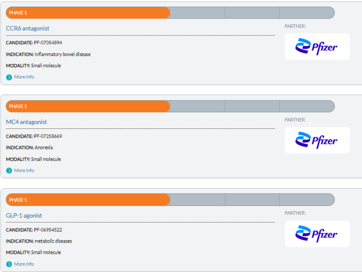 总体而言,辉瑞已与Heptares 合作开发三款药物,均已进入一期临床试验。除了PF-06954522,另外2款药物分别是:PF-07054894(CCR6拮抗剂,用以治疗炎症性肠病),PF-07258669(MC4受体拮抗剂,用以治疗厌食症)。
