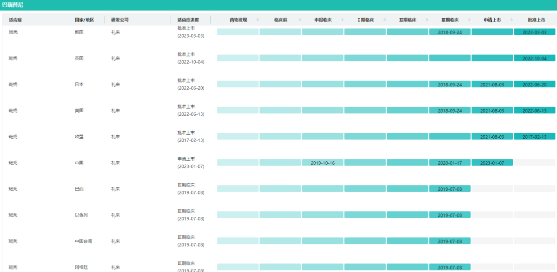 巴瑞替尼于2019年6月在中国获批,用于治疗类风湿性关节炎。2023年3月,巴瑞替尼新适应症在国内获批上市,用于治疗成人重度斑秃,成为国内首个用于系统性治疗重度斑秃的创新靶向药物。