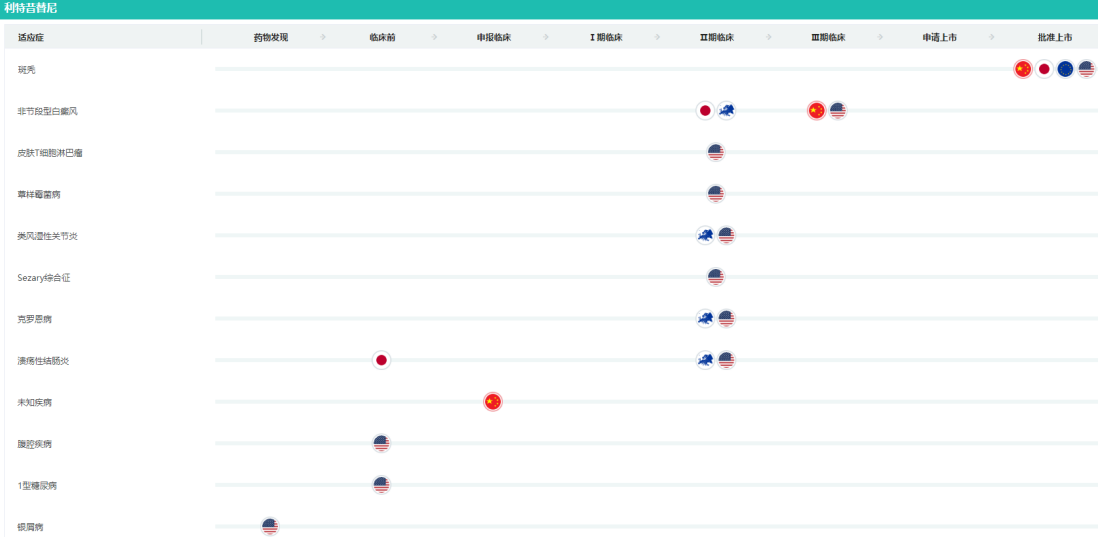 此外,药融云数据库还显示,2022年12月,Ritlecitinib胶囊(利特昔替尼)用于12岁及以上适合接受系统性治疗的非节段型白癜风患者的临床试验申请在国内获批。这是继斑秃、溃疡性结肠炎后,利特昔替尼在国内获批临床的第3项适应症。目前,利特昔替尼在中国和美国均已启动了治疗非节段型白癜风的III期临床研究。