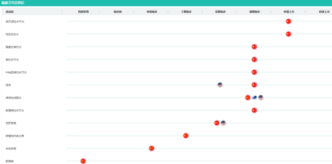 除了特应性皮炎、斑秃,艾玛昔替尼片还在多个自身免疫疾病开展II/III期临床研究,包括溃疡性结肠炎、克罗恩病、类风湿关节炎、强直性脊柱炎、银屑病关节炎等。其也有望成为首个针对自免适应症获批上市的国内自研JAK1抑制剂。