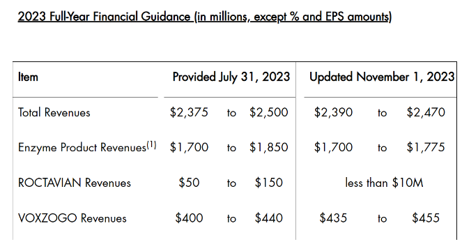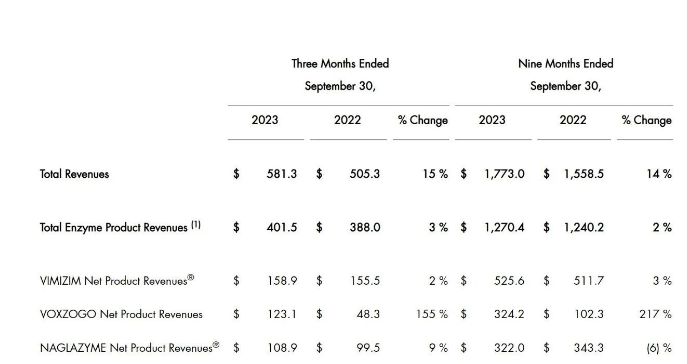 近日,罕见病龙头公司BioMarin Pharmaceutical Inc. (NASDAQ: BMRN) 公布2023年Q3财报。财报显示,2023前三季总收入17.73亿美元(129.77亿人民币,按最新汇率1 美元 ≈ 7.32人民币计算),同比增长14%,现金及现金等价物16.74亿美元(122.52亿人民币)。2023前三季公司的前三大产品销售情况如下: